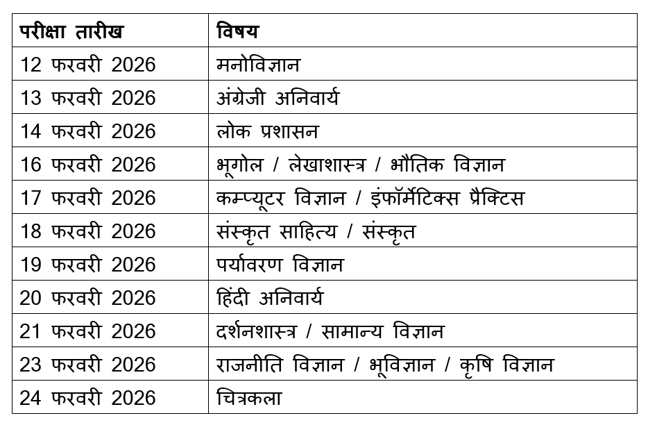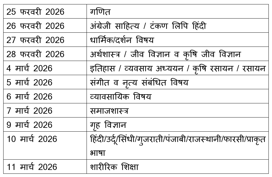 - कक्षा 12वीं परीक्षा समाप्त होने की तारीख: 11 मार्च 2026